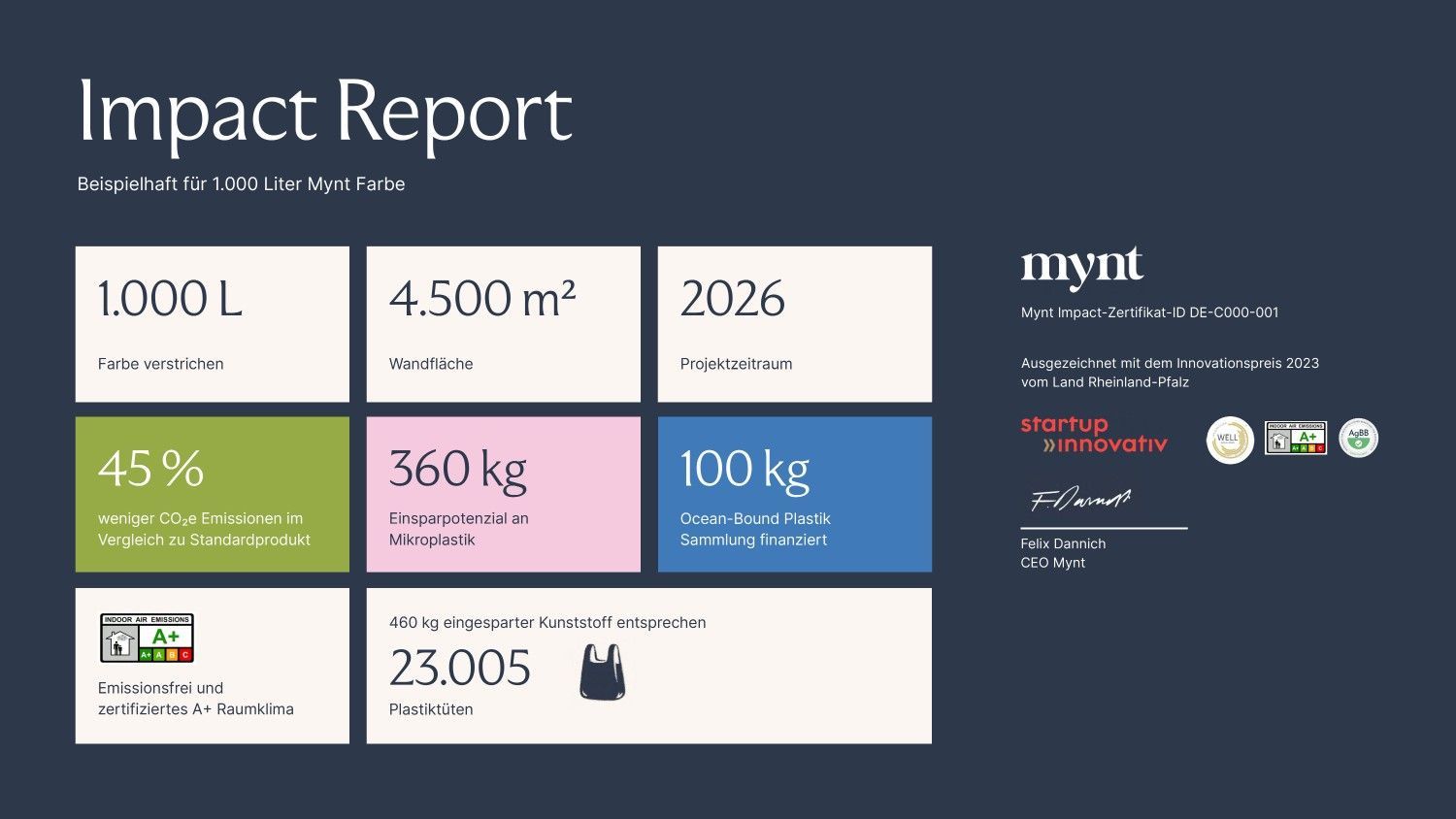 Nachhaltige Alternativen wie Kalk-, Silikat- oder Kreidefarben sind etwas komplizierter in der Anwendung, können meist nicht auf jedem Untergrund verarbeitet werden und ihre Produktion ist zusätzlich CO2-intensiver. Mynt Farben bringen alle Verarbeitungsvorteile von klassischen Premium-Dispersionsfarben inklusive hoher Deckkraft und überdurchschnittlicher Reichweite mit sich.