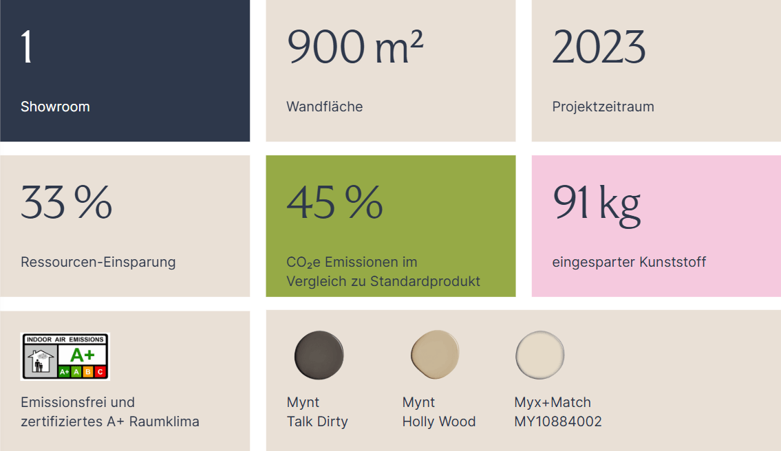 "Die Zusammenarbeit mit Mynt verlief hervorragend – von der schnellen Lieferung bis zur Verarbeitung. Der Lackprimer wurde vom Team besonders gelobt, alle Wandfarben überzeugten ebenso wie die individuell angemischten Töne. Auch die Lacke lieferten ein durchgehend hochwertiges Ergebnis und erfüllten unsere Anforderungen für das neue, weltweit einheitliche Showroom-Farbkonzept"