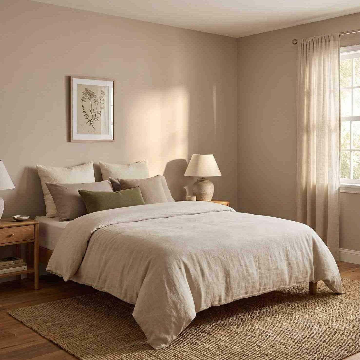 Im Schlafzimmer vermittelt eine beige Wandfarbe Ruhe und Gelassenheit. Dunklere Töne lassen den Raum kleiner erscheinen und laden zum Entspannen ein. Durch seine neutrale Natur wirkt es beruhigend auf das Auge und fördert einen ruhigen Schlaf. Kombiniert mit dunklen Möbeln oder Accessoires wie Teppichen oder Vorhängen entsteht ein eleganter Kontrast.